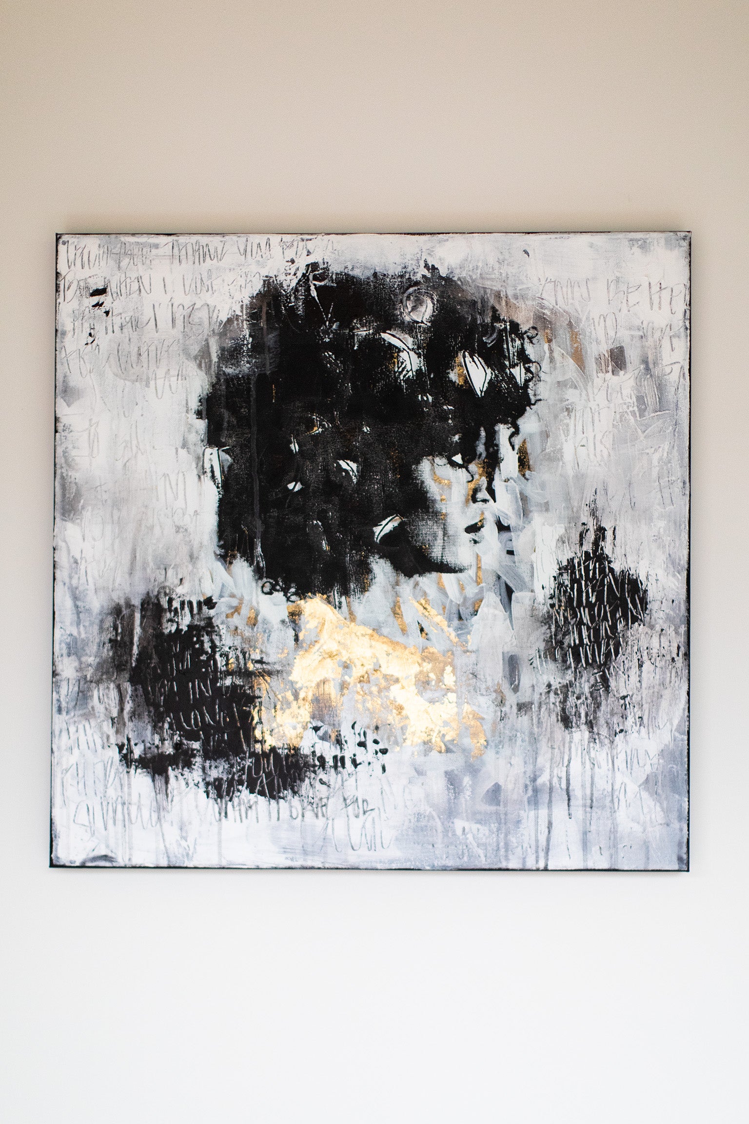 “Now turn to the left, (Cortney-A4)” is mixed media street art by Addison Jones featuring her own portrait photography. It’s produced using gold leaf on stretched canvas. This piece is the original. Neiman Marcus sold the reprints. These can be classified as Contemporary Art, Mixed Media Art, and Street Art.